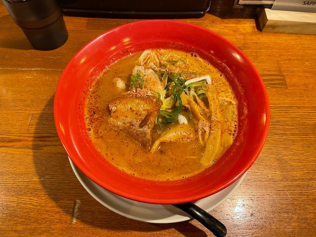 「もうこれしかない!」と辛味海老豚骨ラーメンを注文しました。