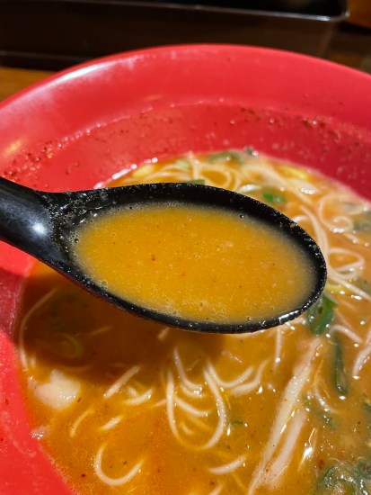 ドロッとしたこってり系のスープだから、中太麺か太麺の方が無難な気がしますが、とりあえず一口。